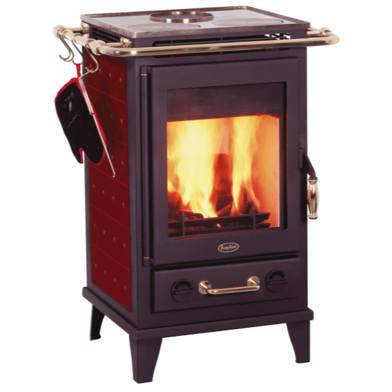 Fireplace sin Florence-komfyr presenterer seg som en rustikk komfyr utstyrt med to rustfrie kokeplater. Ovnen egner seg både som en varmekilde og som en ovn. Håndtakene og rekkverket er elegant utført i messing, mens sidepanelene er prydet med keramiske fliser.